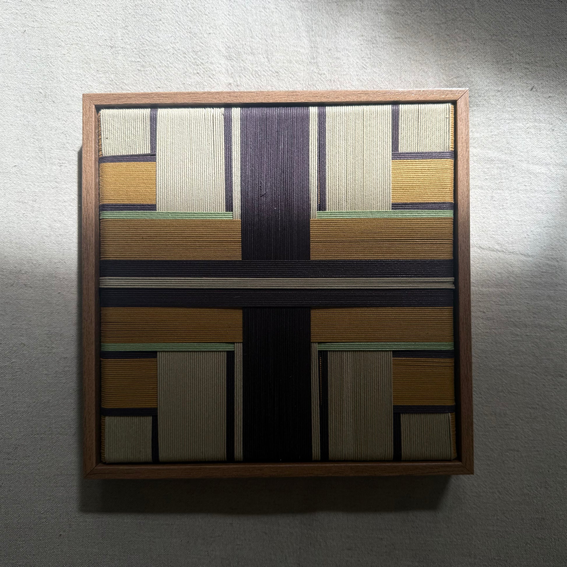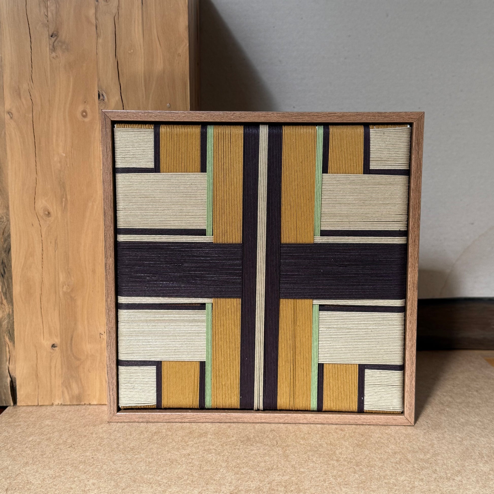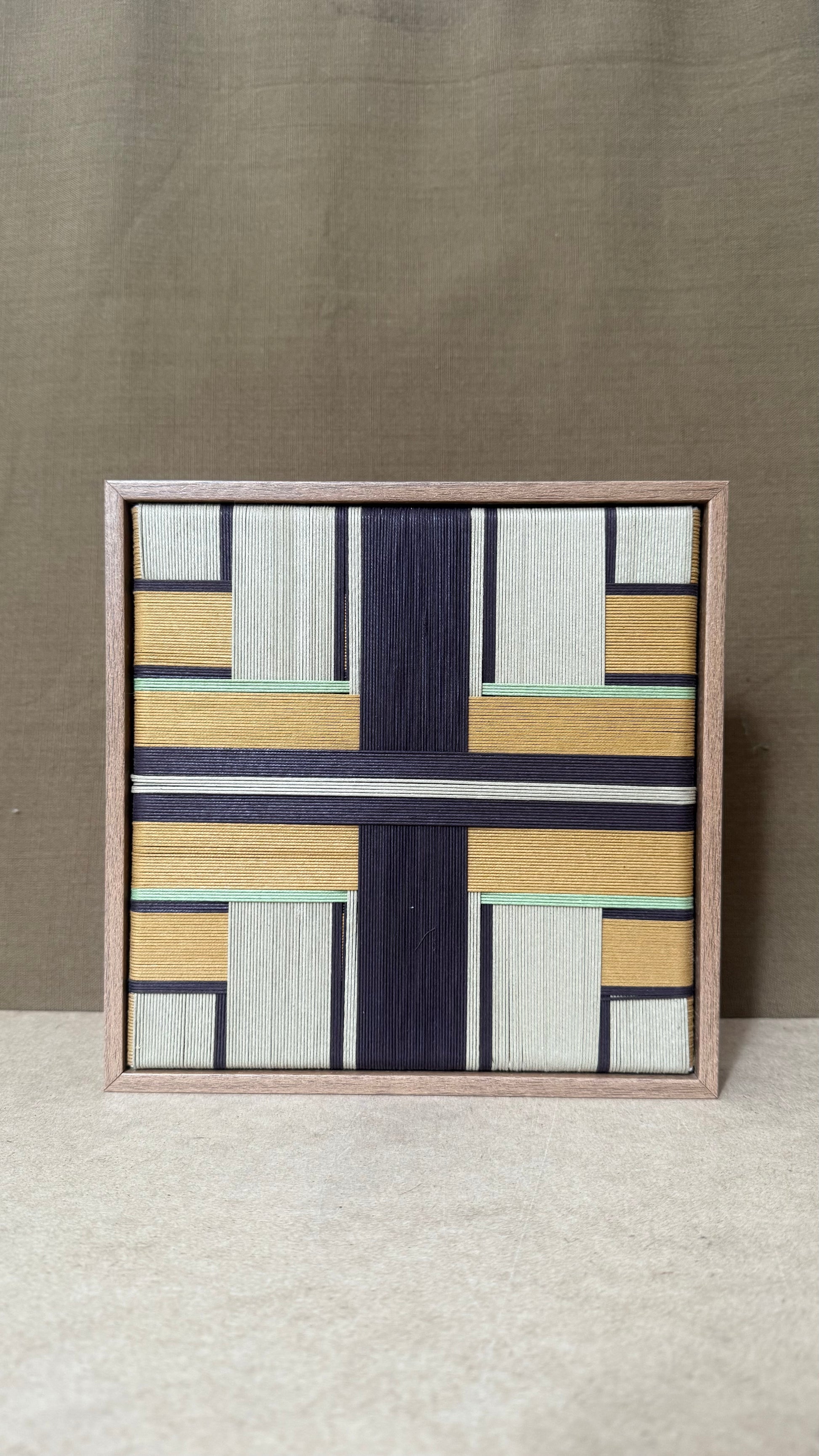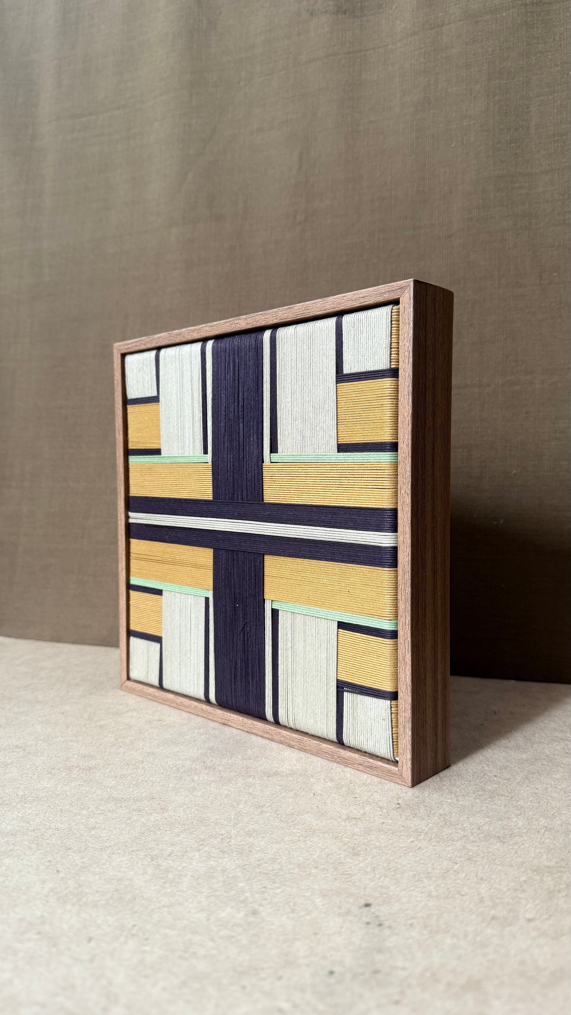 A coleção Entre Linhas é um encontro entre a tradição artesanal e o design contemporâneo. Cada peça é criada manualmente com fios de algodão e finalizadas com moldurada em madeira, transformando a geometria em poesia visual.