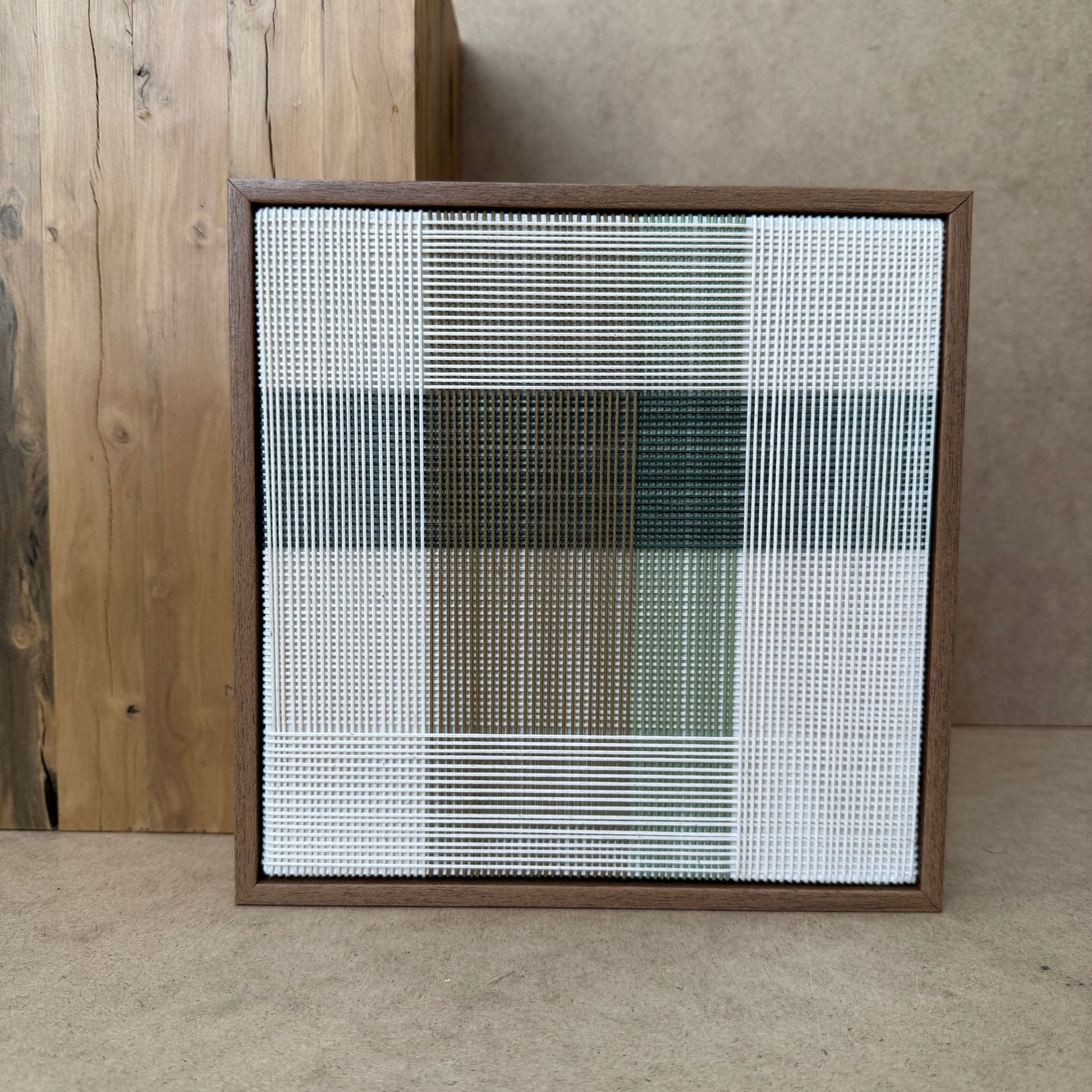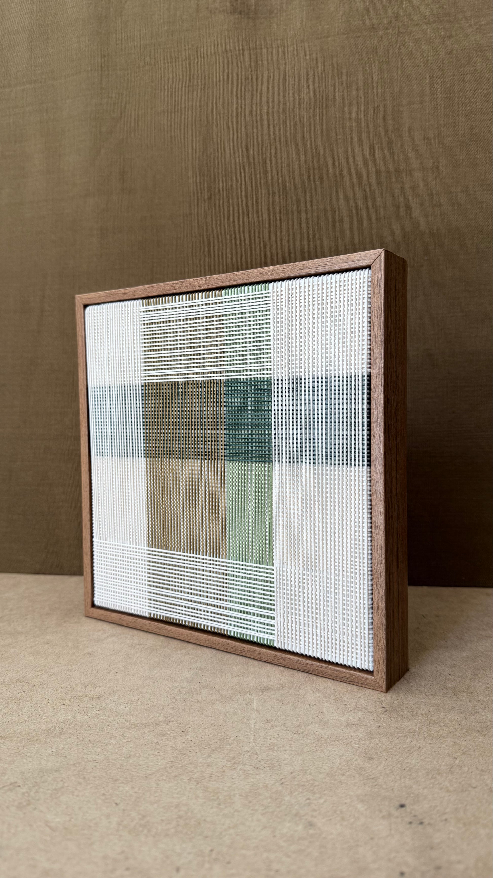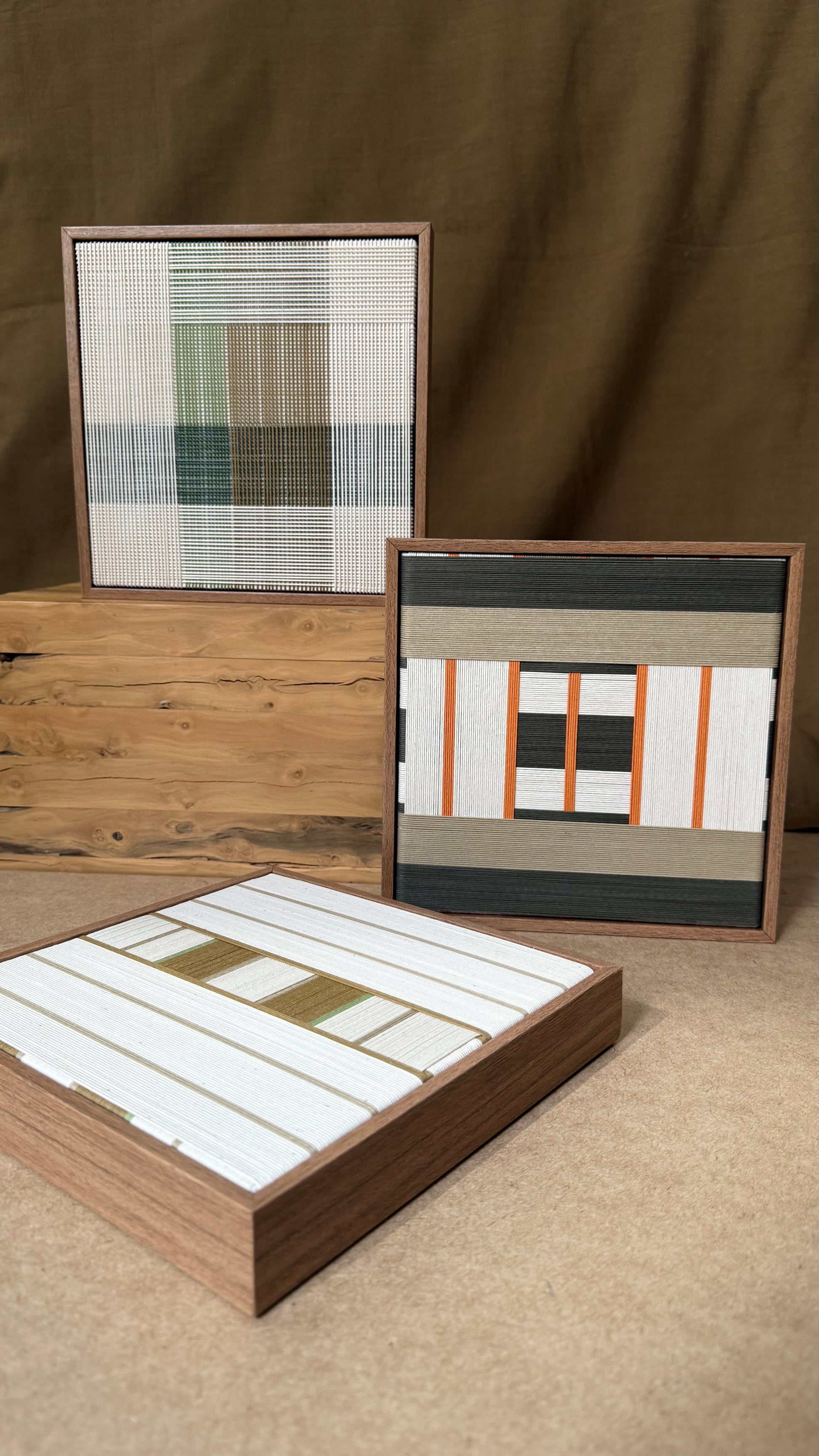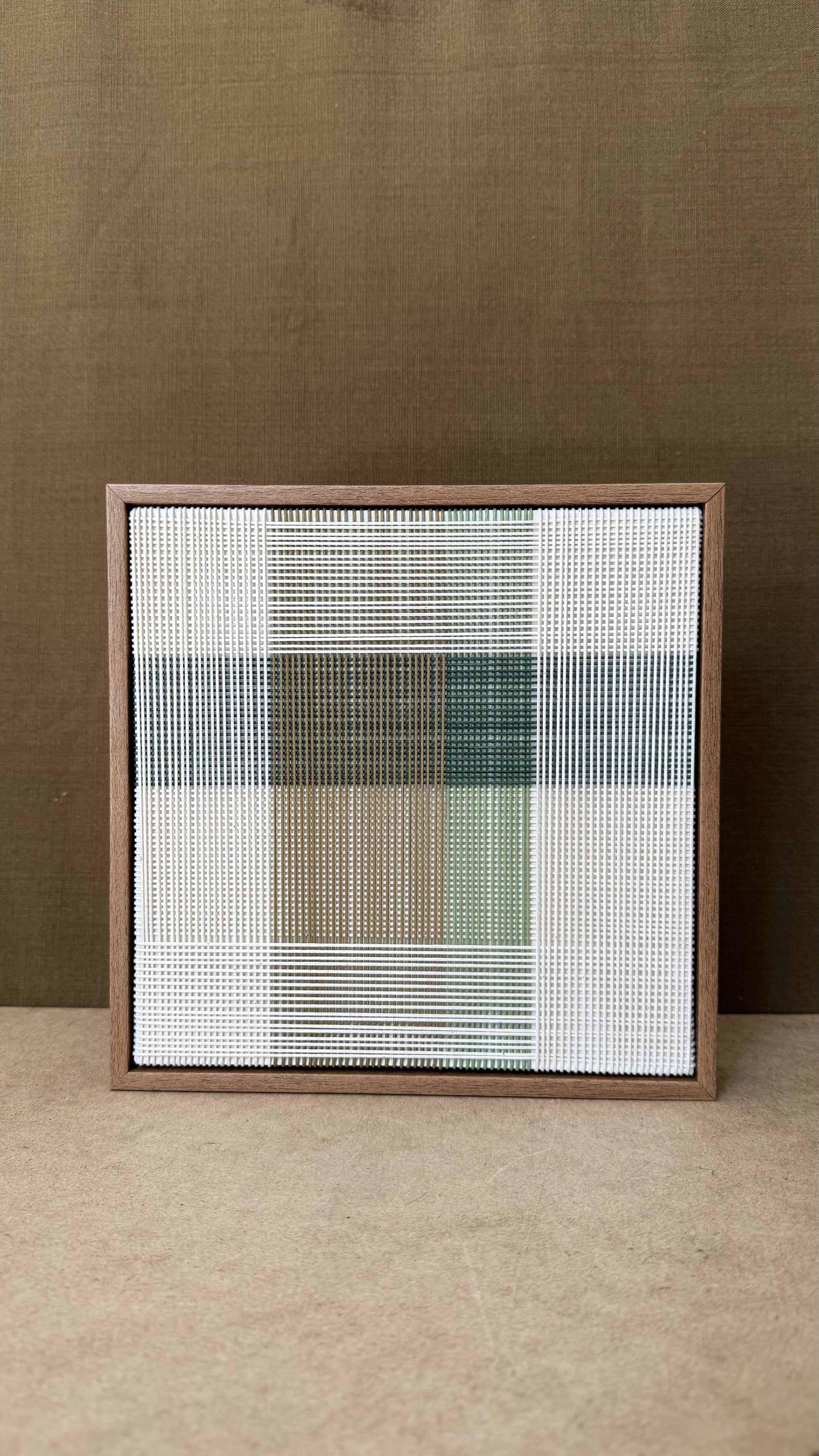 A coleção Entre Linhas é um encontro entre a tradição artesanal e o design contemporâneo. Cada peça é criada manualmente com fios de algodão e finalizadas com moldurada em madeira, transformando a geometria em poesia visual.