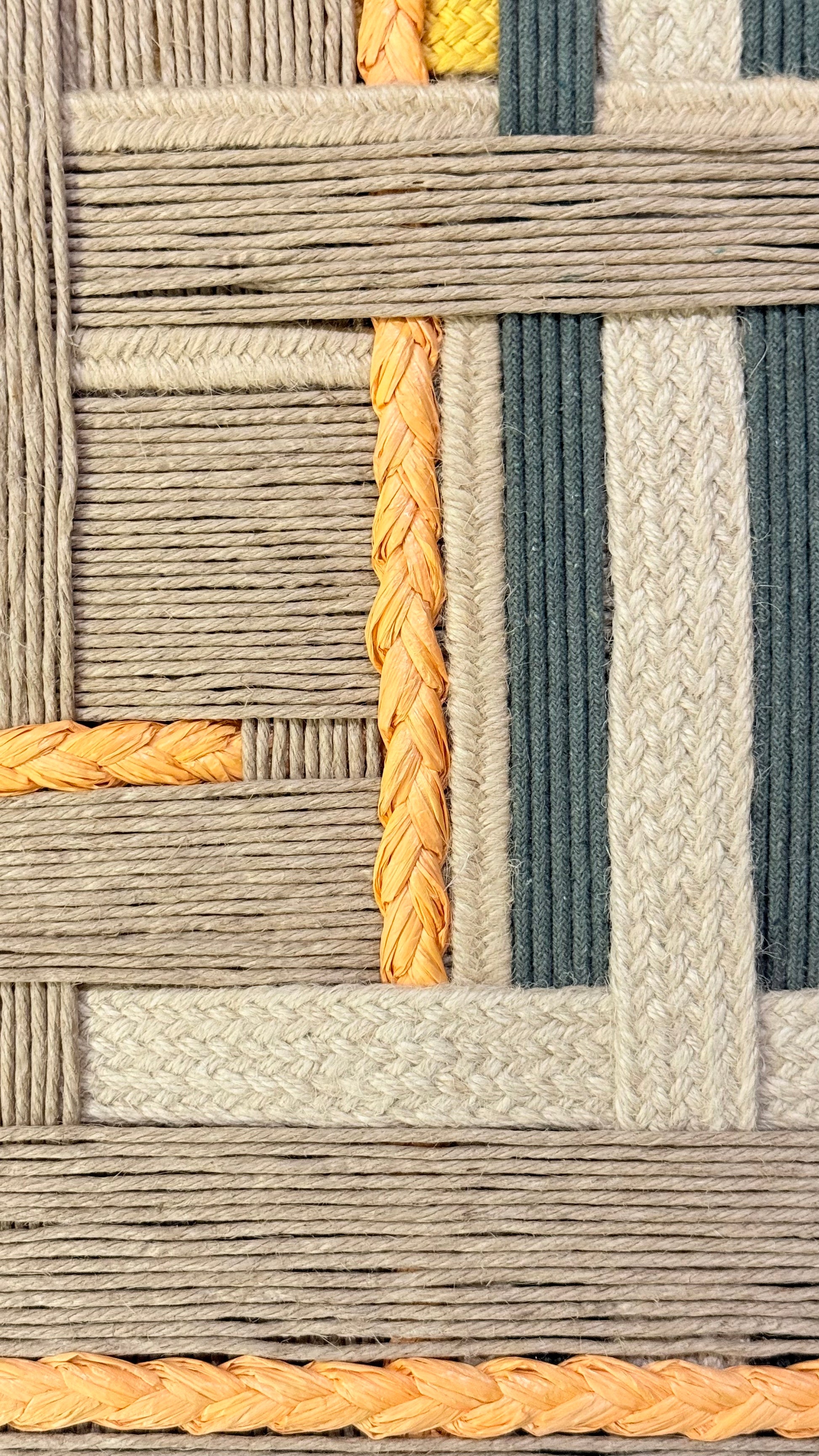 Uma composição que explora o contraste entre o rústico e o delicado, Trama #07 é um quadro têxtil feito em sisal, algodão verde e cru. As linhas retas e as listras formam uma paisagem gráfica de texturas naturais, revelando a força do simples.