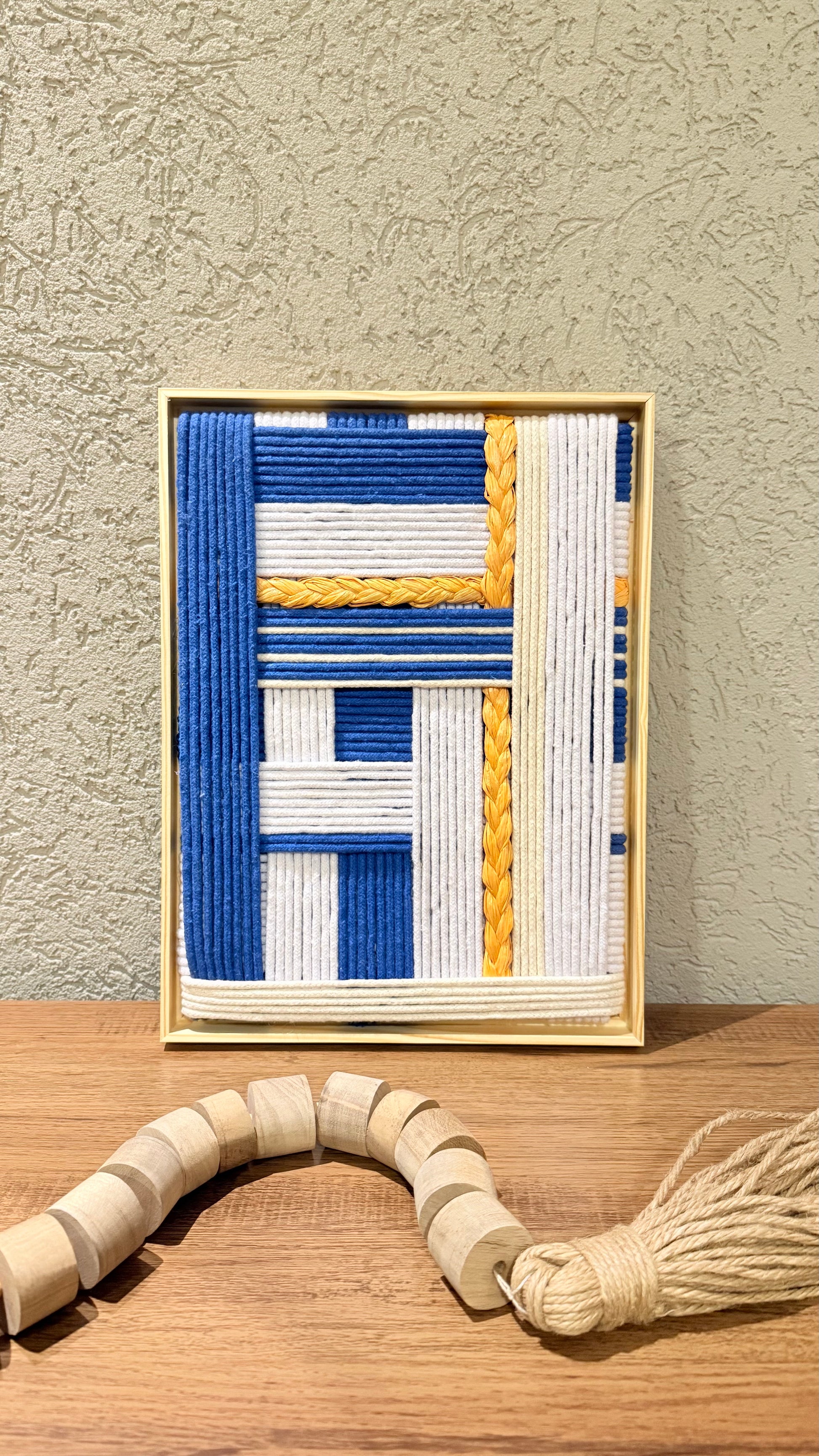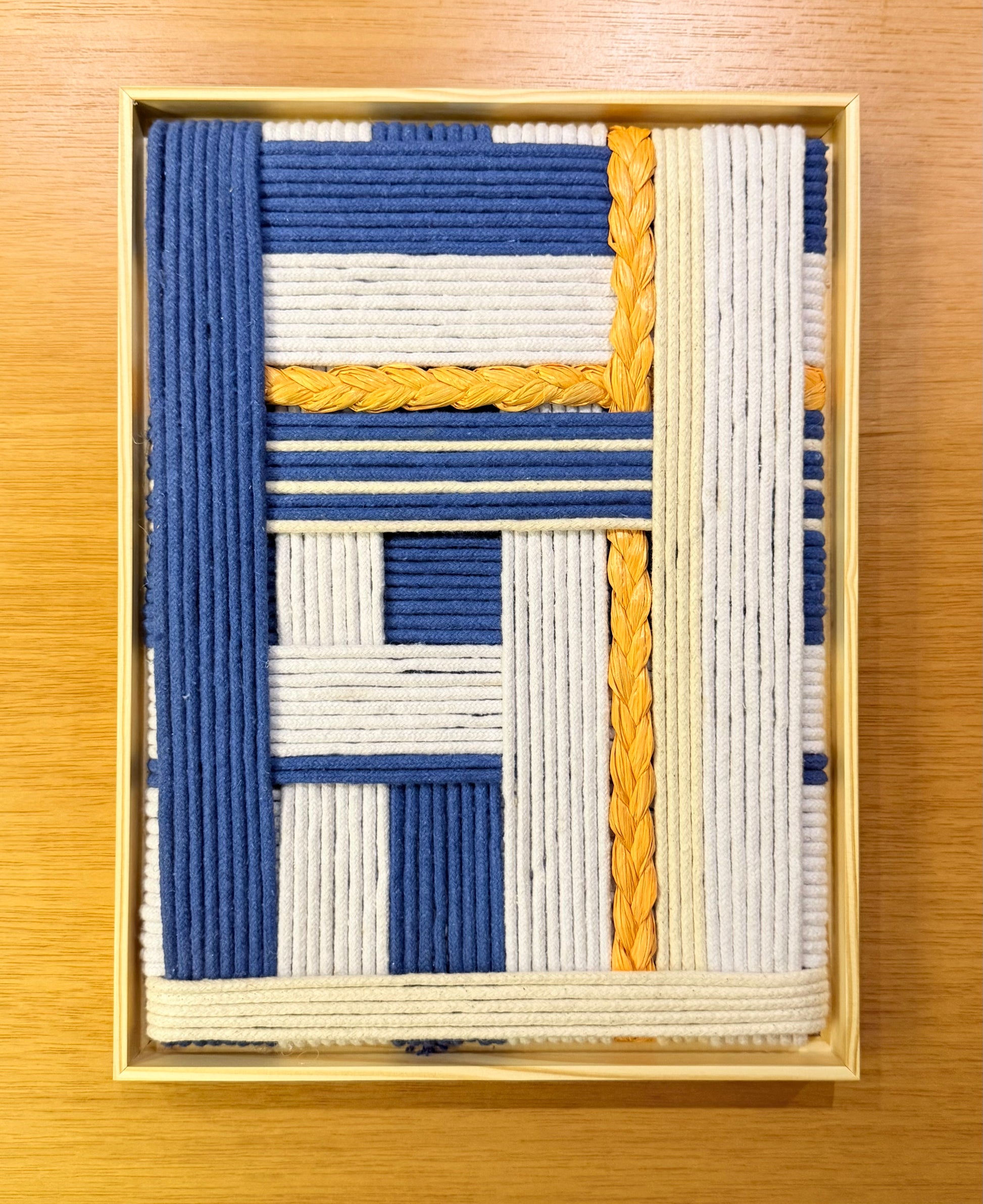 Uma composição que explora o contraste entre o rústico e o delicado, Trama #10 é um quadro têxtil feito em algodão azul e cru e trança de poliéster em laranja. As linhas retas e as listras formam uma paisagem gráfica de texturas naturais, revelando a força do simples.