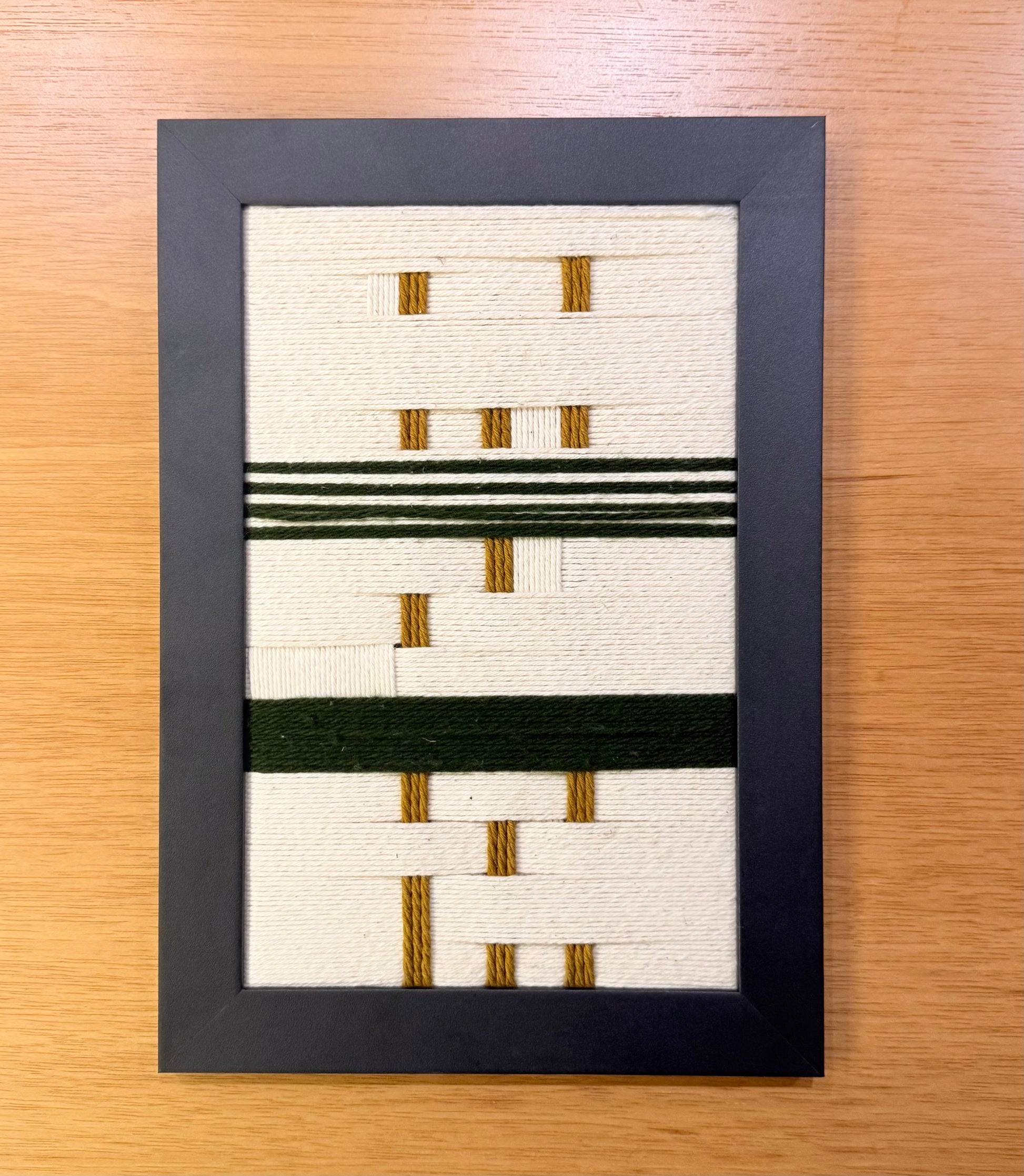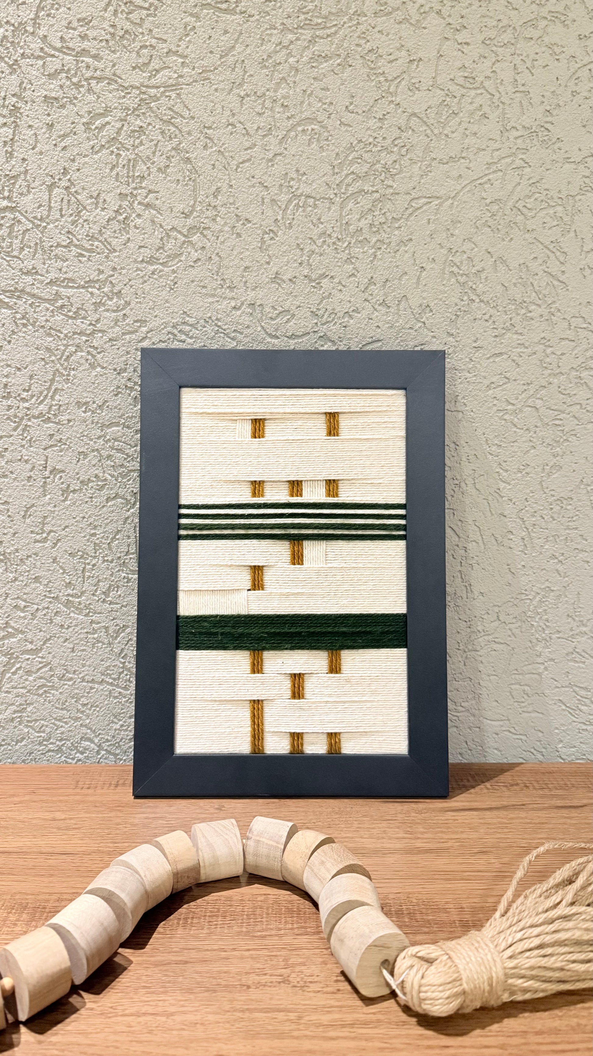 Essa peça única combina precisão gráfica e textura artesanal em uma composição que valoriza o equilíbrio e o contraste. Feita manualmente com fios de algodão em tons de verde, off white e cobre, apresenta um jogo de padronagens lineares entrelaçadas, criando ritmo visual e profundidade. A moldura em madeira clara realça a sofisticação natural do trabalho.