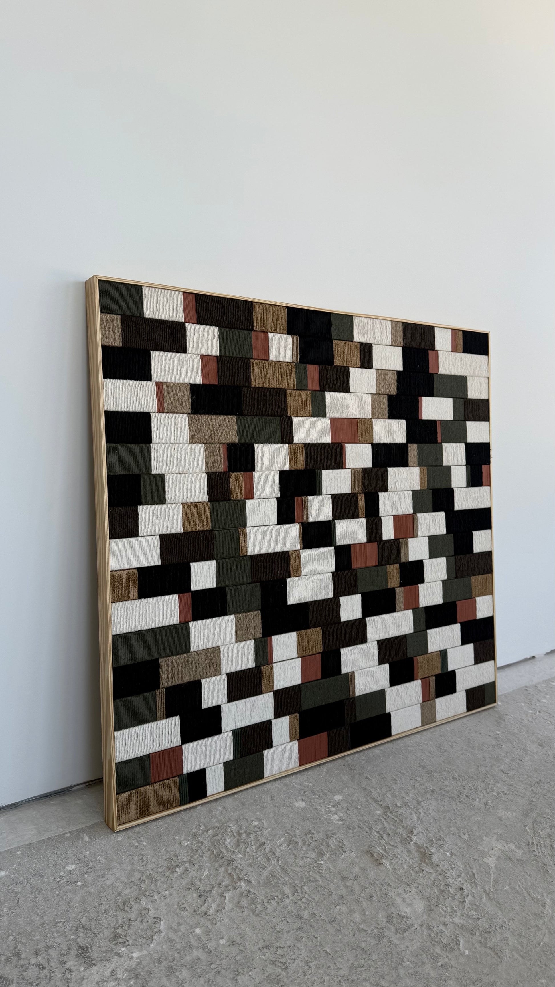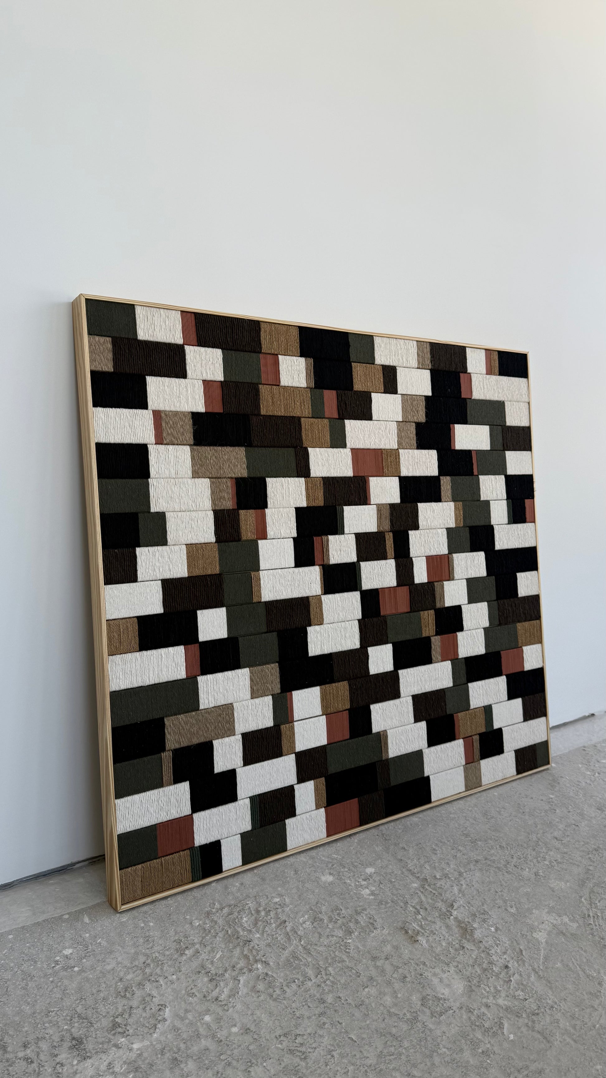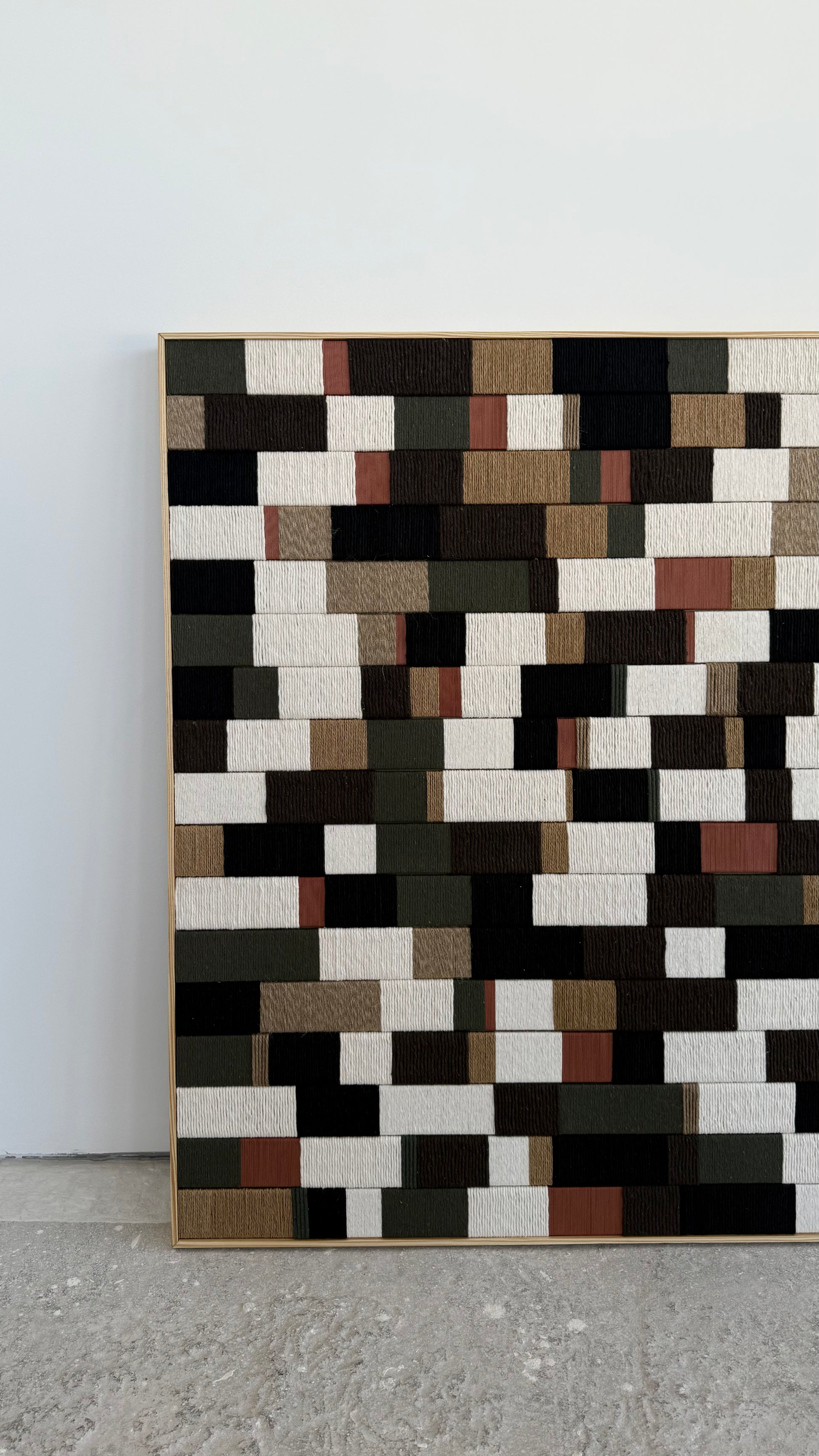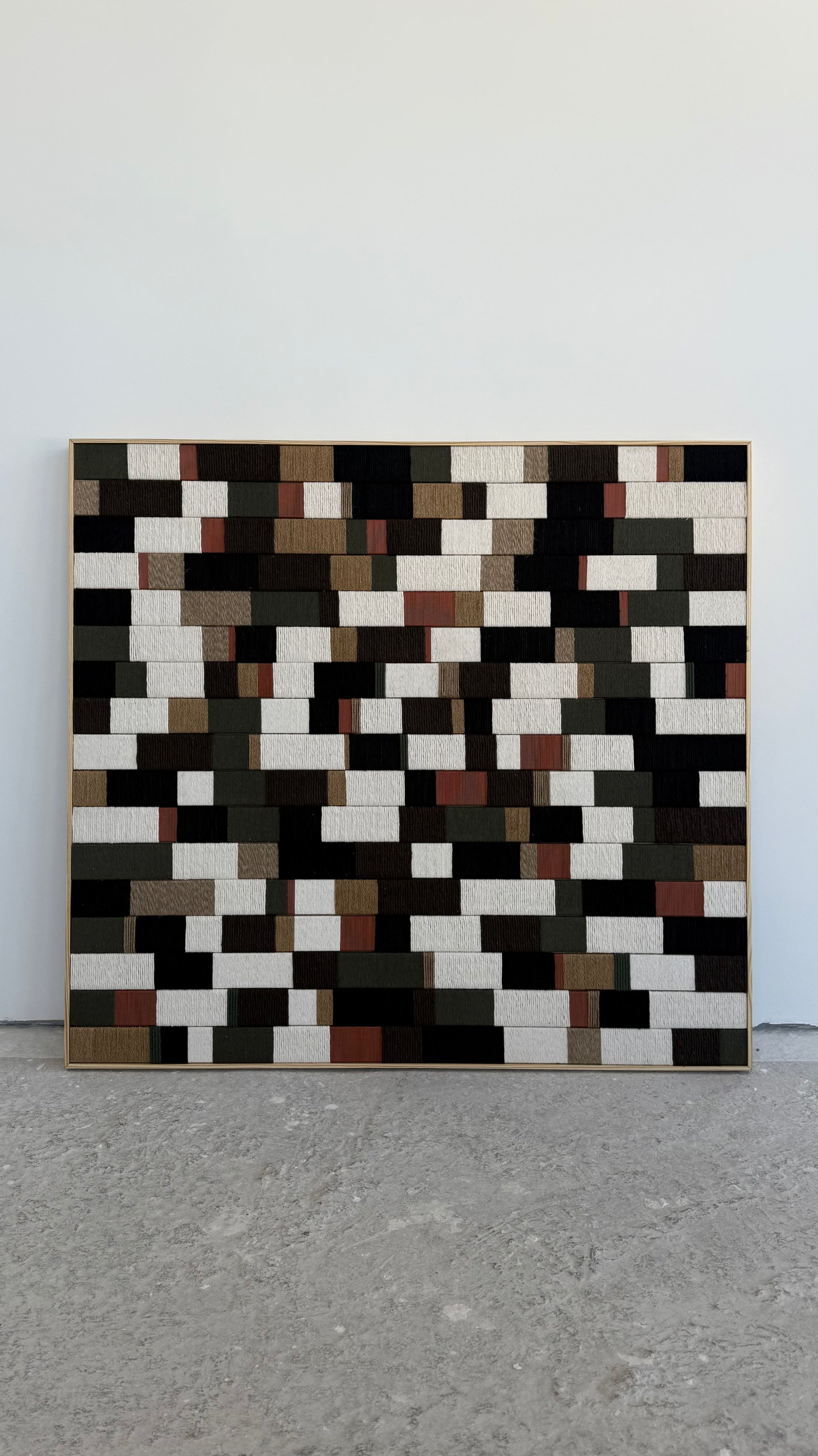 Na interseção entre arte têxtil e design contemporâneo , Essa obra evoca equilíbrio e arquitetura visual. A obra é construída a partir do entrelaçamento manual de fios de algodão em diferentes direções, volumes e tensões, criando um campo gráfico tridimensional de texturas e pausas.