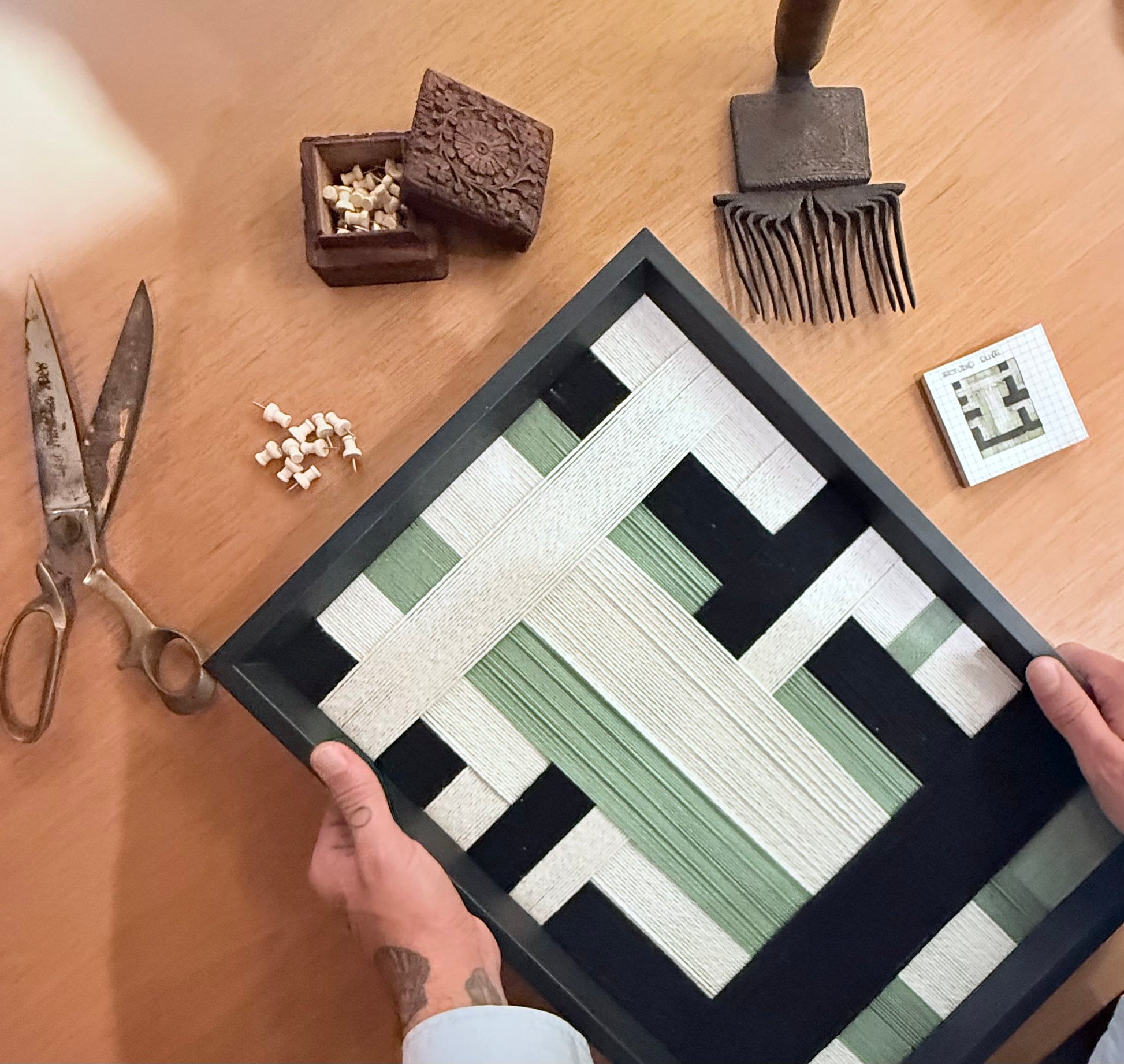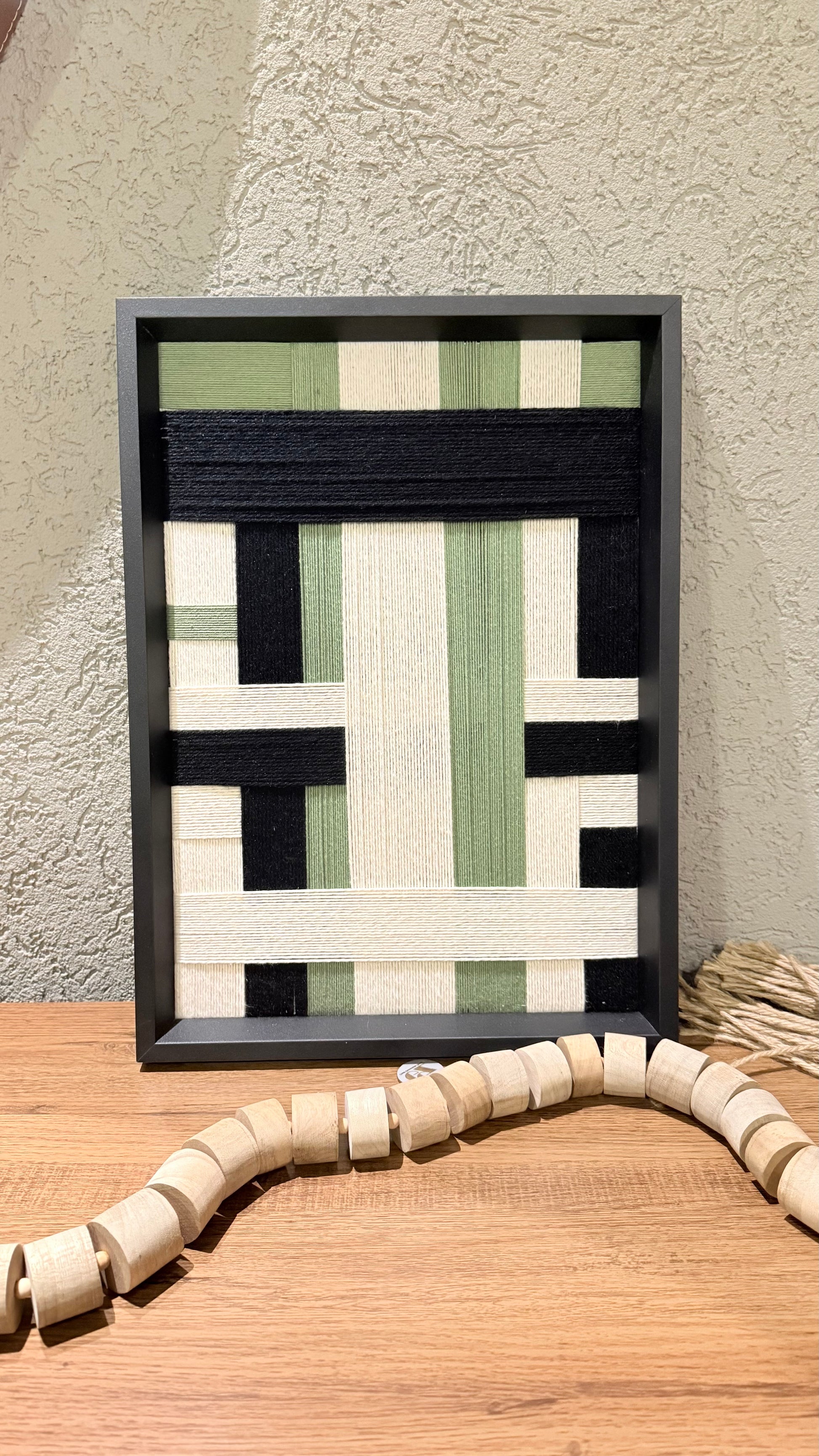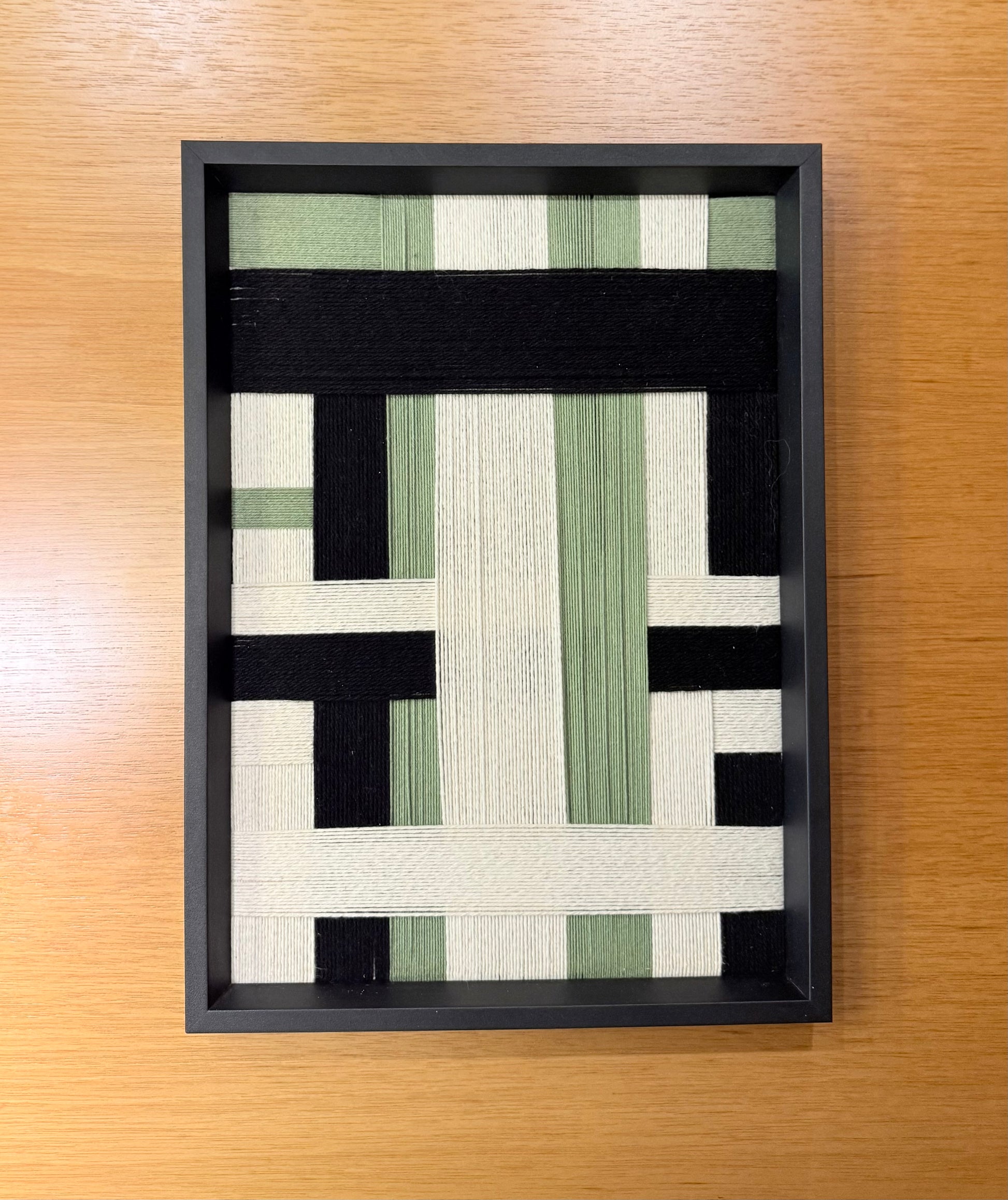 Composição gráfica e o gesto manual se entrelaçam em Trama #02, uma peça que investiga a construção da imagem através da repetição, ritmo e sobreposição de fios. Entre tons naturais, verdes e pretos, a obra propõe um olhar pausado sobre a rigidez das estruturas e a suavidade dos materias.